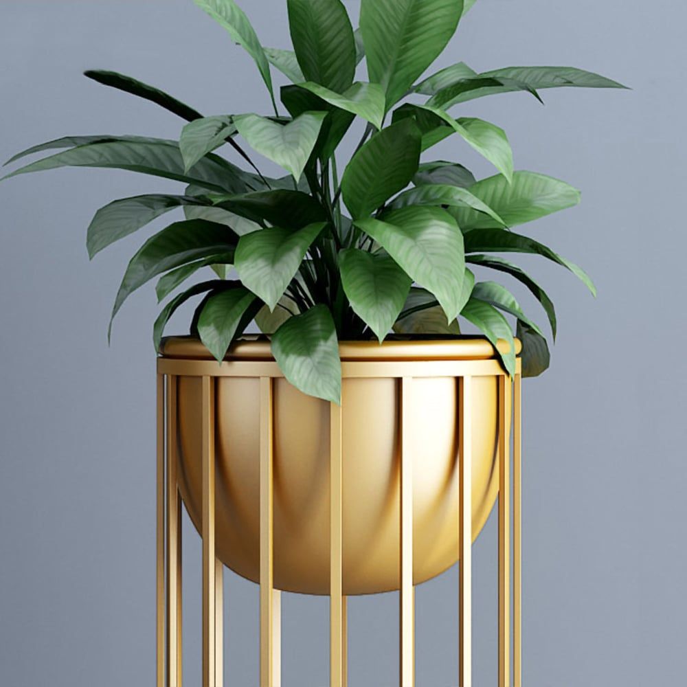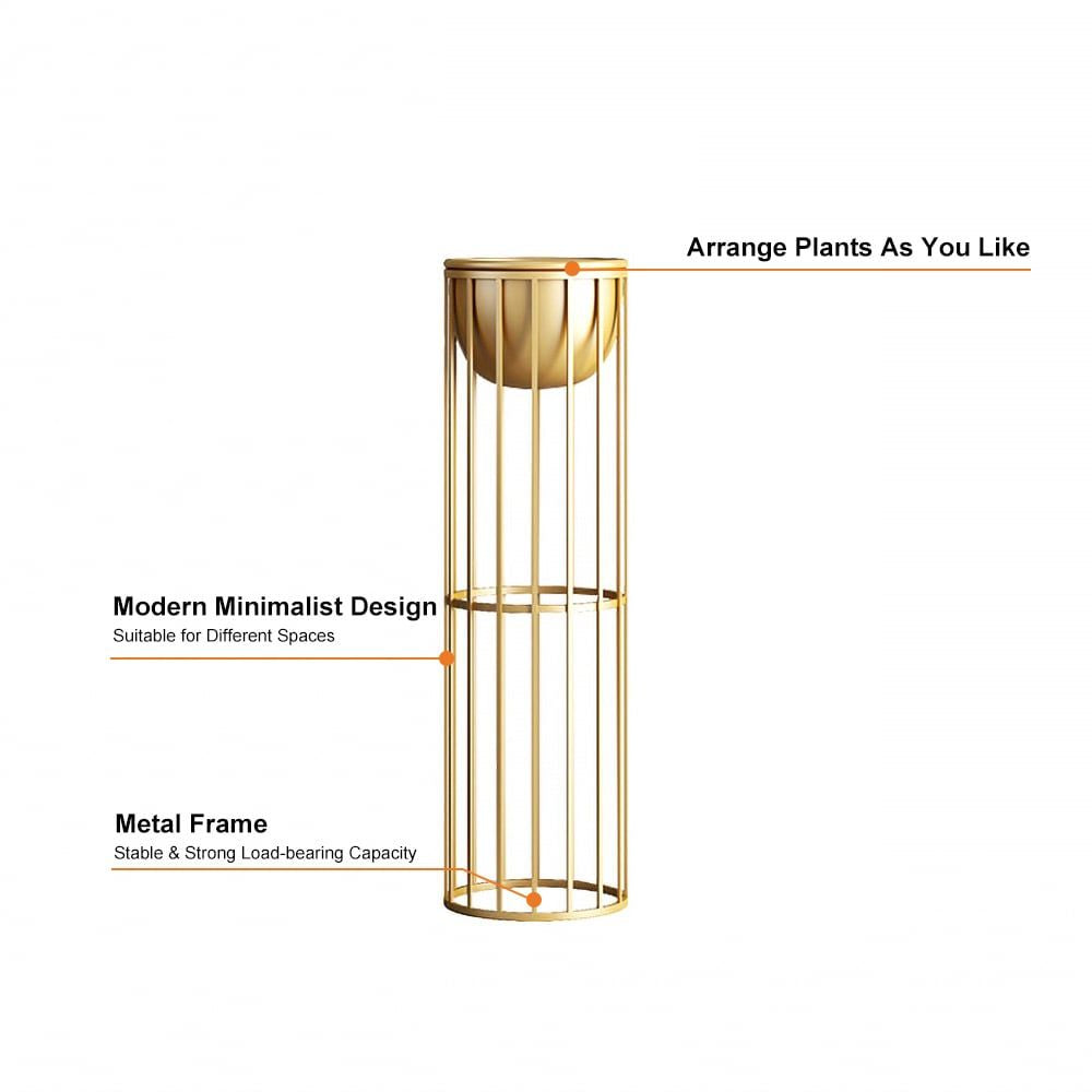 23.6" Gold Plant Pot Indoor Modern Metal Planter with Gold Stand enhances your interior with a touch of elegance and greenery. Crafted from durable metal with a sleek gold finish, this stylish planter elevates your plants while bringing modern sophistication to your space. The included gold stand allows for elevated display, yet the pot may also sit directly on the floor or shelf for flexible styling.