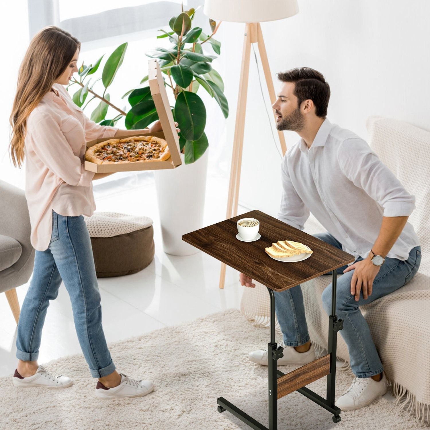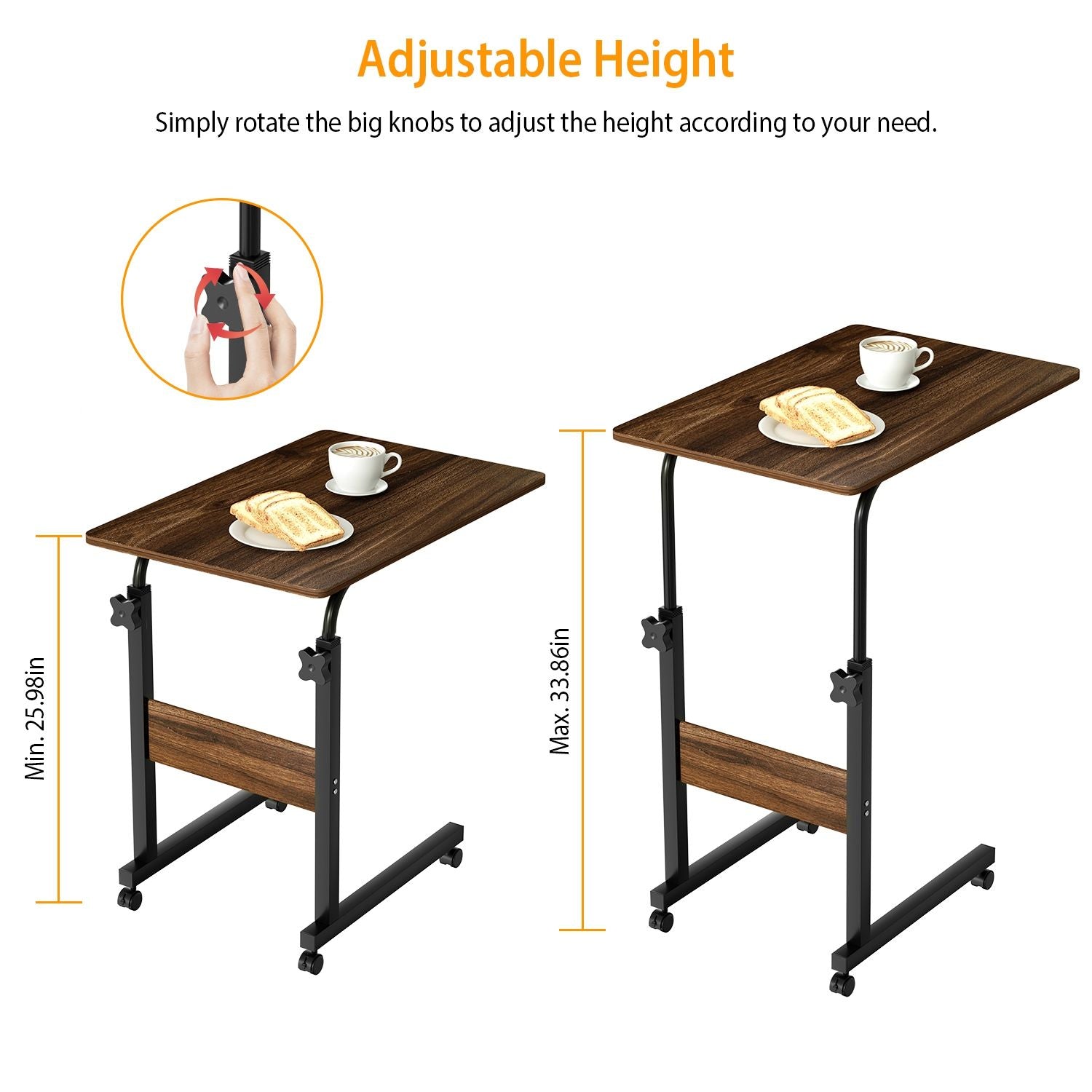 Designed with a practical C-shaped frame, the table easily hugs your sofa or bed, bringing your workspace or snack table closer for effortless use. The adjustable height feature allows you to raise or lower the table from 25.98 to 33.86 inches, ensuring the perfect fit for sitting, lounging, or working.