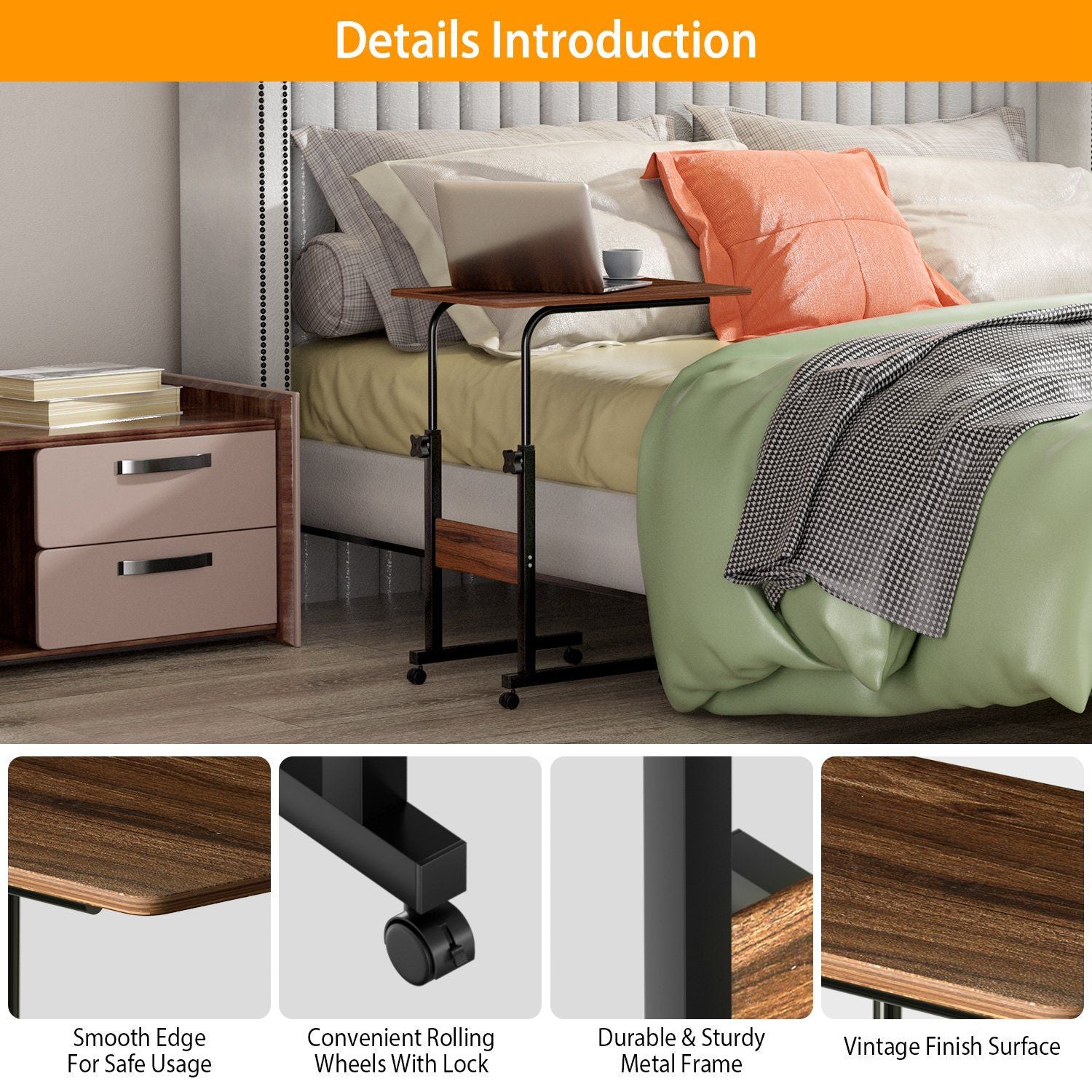 Equipped with four smooth-rolling wheels, this side table moves easily from room to room. Two wheels include locking brakes to keep the table steady when needed. Its lightweight structure, sturdy wood surface, and simple assembly make it an ideal functional piece for any home. With all accessories and instructions included, assembly takes less than 15 minutes.