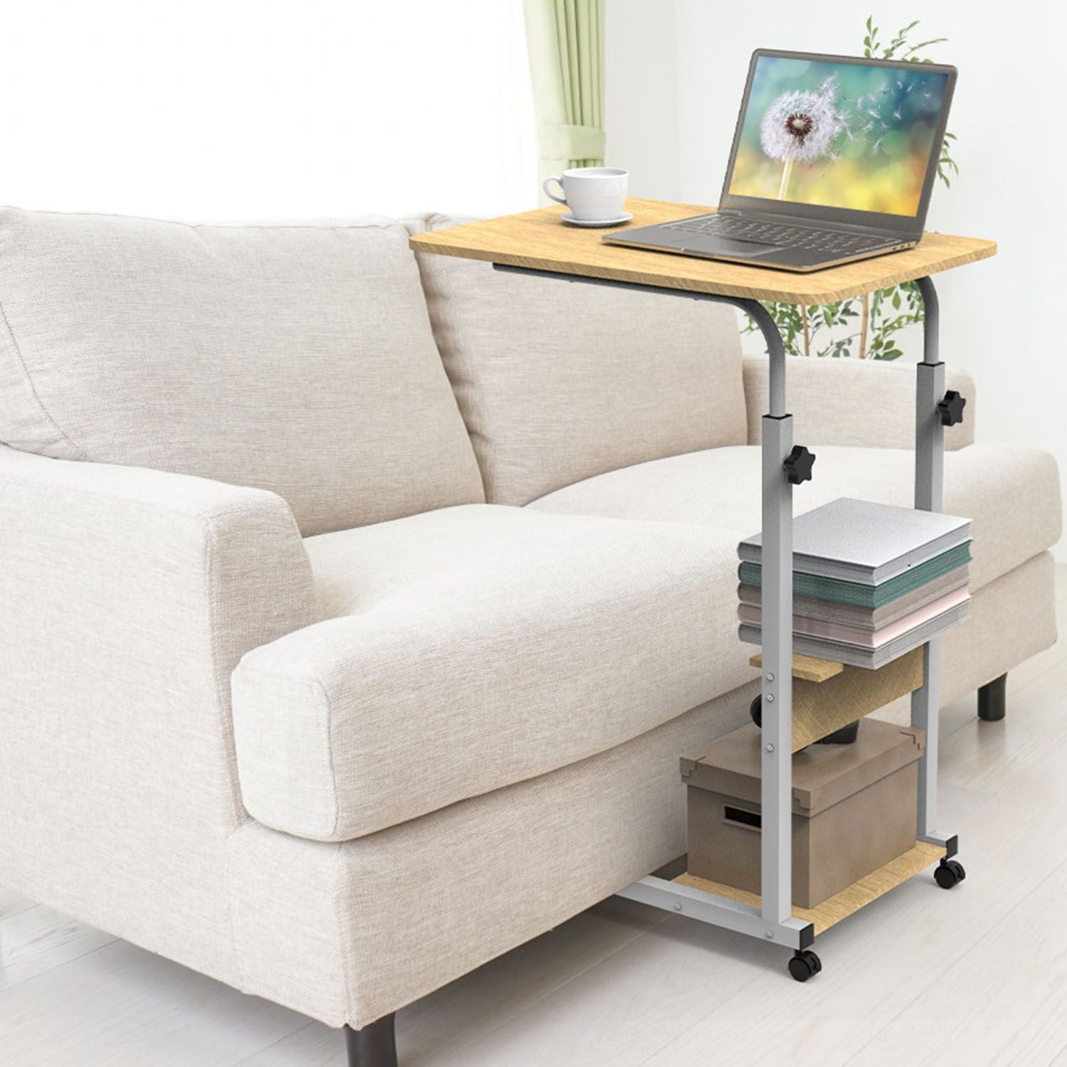 C-Shaped Side Table with Adjustable Height – 3-Tier Slim Laptop Desk on Wheels for Couch, Bed, and Small Spaces