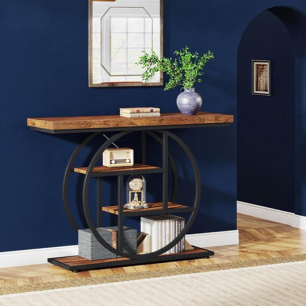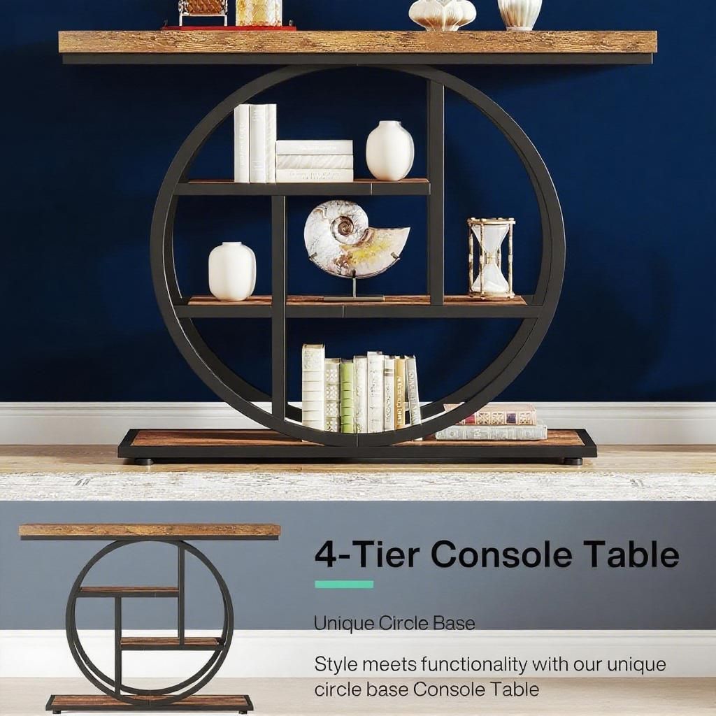 Console Table Sofa Table Entryway Table delivers industrial charm and functional design in one stylish piece. Featuring a sturdy circular metal frame and rustic brown MDF shelves, this 41.3" console table balances strength, durability, and visual appeal. Its four staggered tiers provide ample storage and display space for books, framed photos, vases, or decorative accents, making it perfect for hallways, behind the couch, or entryways.
