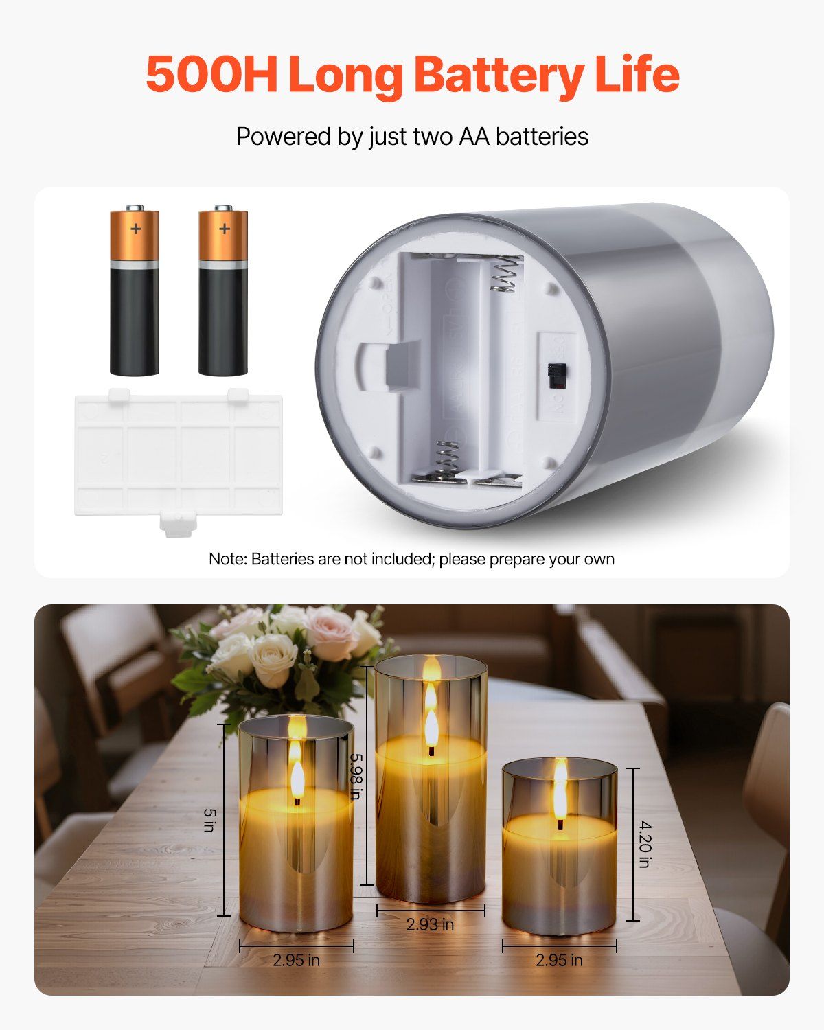 Powered by only two AA batteries each, these flameless candles provide up to 500 hours of illumination lasting months when used with the timer cycle. Whether you’re decorating your bedroom, living room, fireplace mantle, dining table, or event space, these elegant LED candles add cozy atmosphere for everyday use or special occasions.