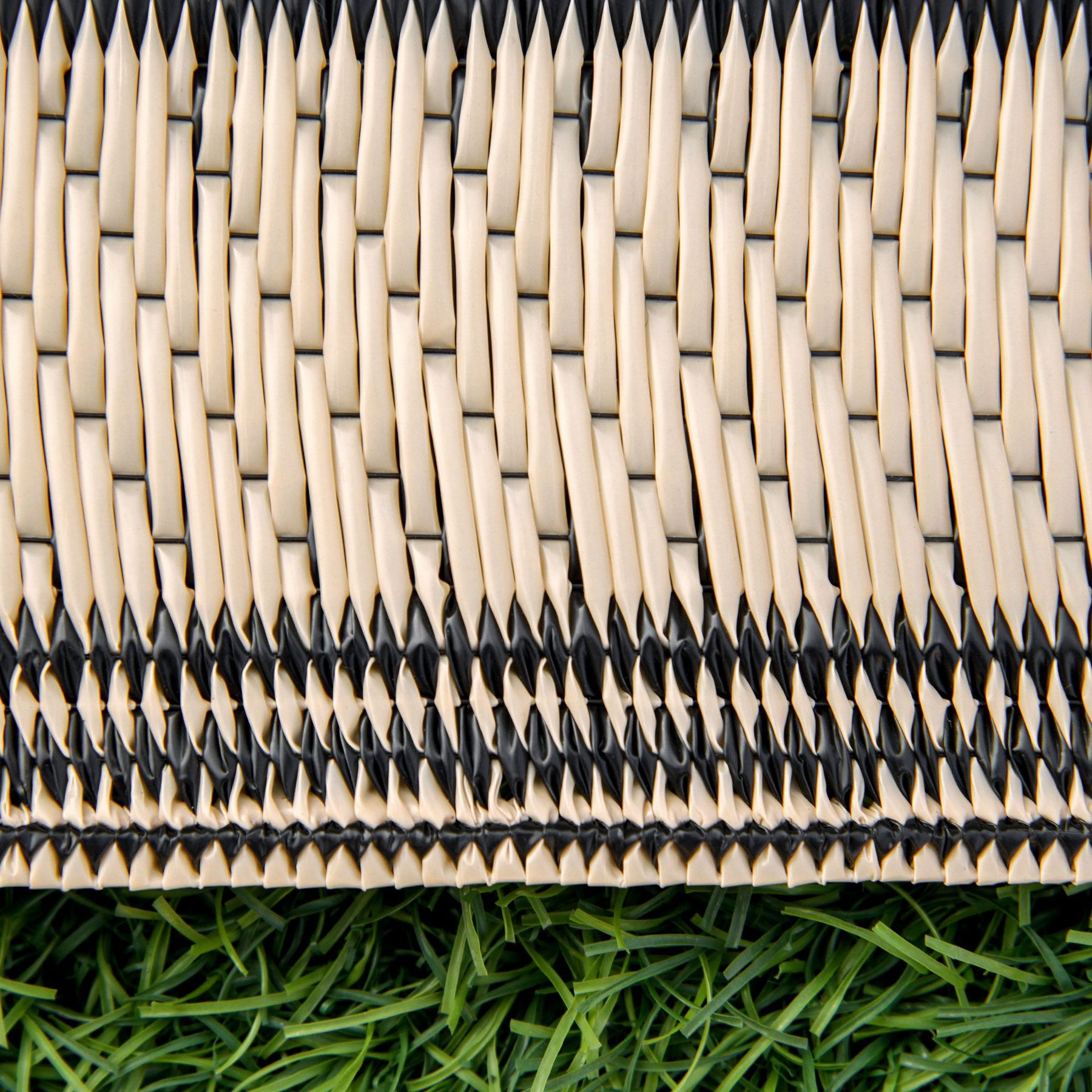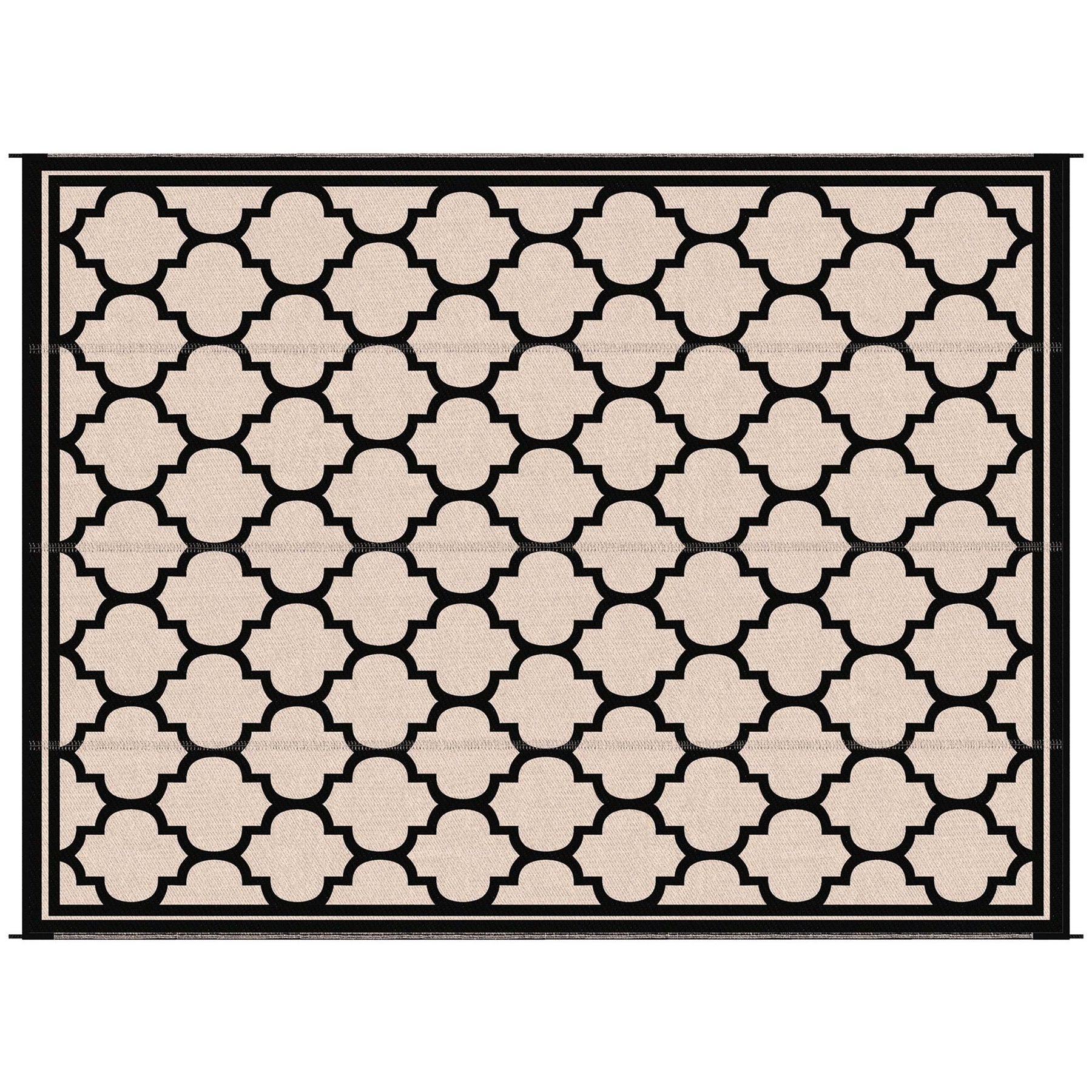 Modern Reversible Outdoor Rug 9x12 Black Beige Transform your outdoor spaces with the Outsunny 9x12 Modern Reversible Outdoor Rug, designed for both beauty and durability. Crafted from 100% waterproof polypropylene, this foldable plastic rug resists fading, fraying, and moisture, making it a reliable choice for patios, decks, RV trips, or beach camping. The elegant black and beige pattern is reversible, allowing you to refresh your outdoor décor instantly with a simple flip. Cleaning is effortless, just rinse, sweep, or wipe clean, and your rug will be ready for use again. Built for stability, it includes four corner loop straps to keep it securely in place even on windy days. Whether for backyard lounging, picnics, or RV road adventures, this Out-sunny outdoor rug adds modern comfort and practical charm to any outdoor setting.